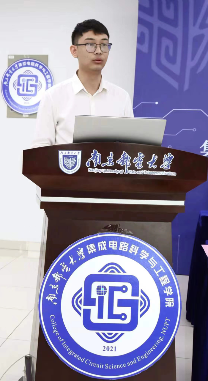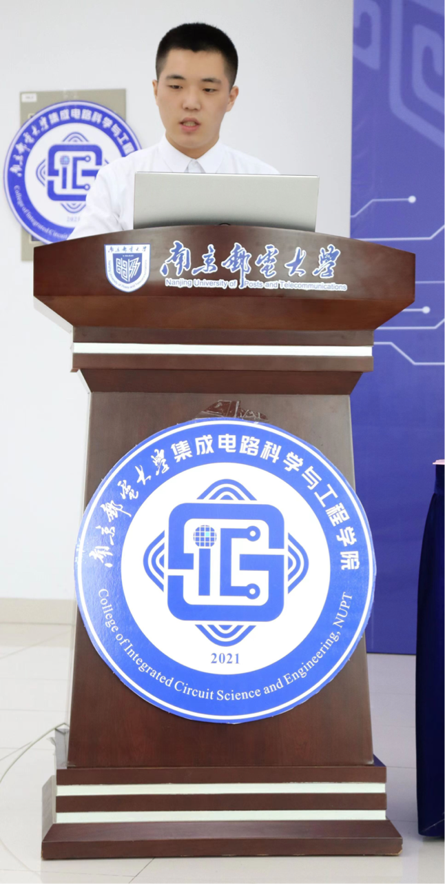 研究生老生代表姚清博士发言。在南邮求学六载,他分享了他眼中的南邮“卷王”,他们是敢为人先、顶天立地的科研人,他们是知行合一、学以致用的科研人,他们是万锤成器、偏毫不安的科研人。他还提醒研究生同学们在专心科研的同时还要保持良好的心态,享受健康、美好、充实的求学时光。