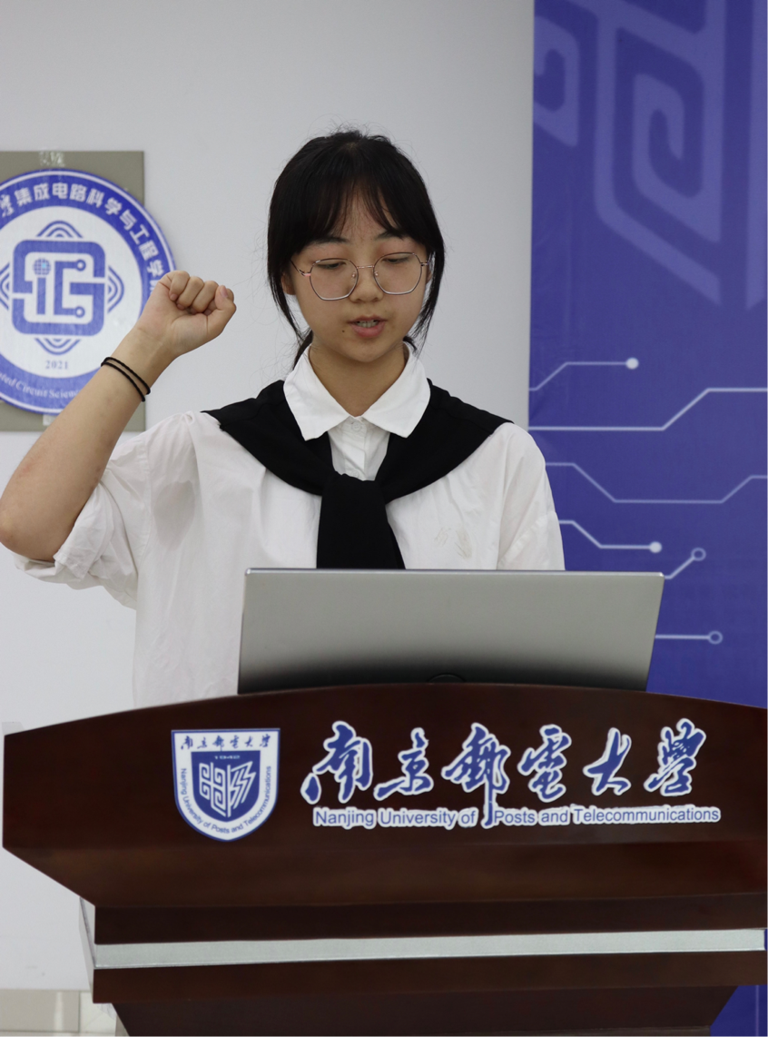 本科新生代表蒋梓莜同学表达了来到南邮求学的激动与喜悦以及对未来南邮学习、生活的美好憧憬,并带领全体新生宣誓——作为集成学子,我们必将初心不改,不负使命,集成梦想,“芯”系未来。