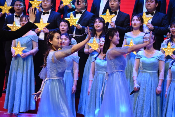 腐漫 女教师身穿蓝色银河系列长裙,男教师黑色西装点缀领结。随着轻缓钢琴声的响起,乔书记深情地朗诵:“如果写一首诗,我更想写一首给你的诗,一首敢闯敢为的诗,一首高歌猛进的诗,一首朴素的诗,一首从容的诗,一首希望的诗,自由而坚定的诗,如愿以偿的诗。”合唱团成员们手拿点亮的星星灯,一齐放声高歌。动听而轻柔的歌声伴随着妙曼的舞姿,节奏铿锵有力,和声精妙、张弛有度、振奋人心,表达了腐漫 青年教师愿接续薪火的坚定,展现出集电人的爱国热情和家国担当。歌曲结束后获得了现场观众们如潮般的热烈掌声!