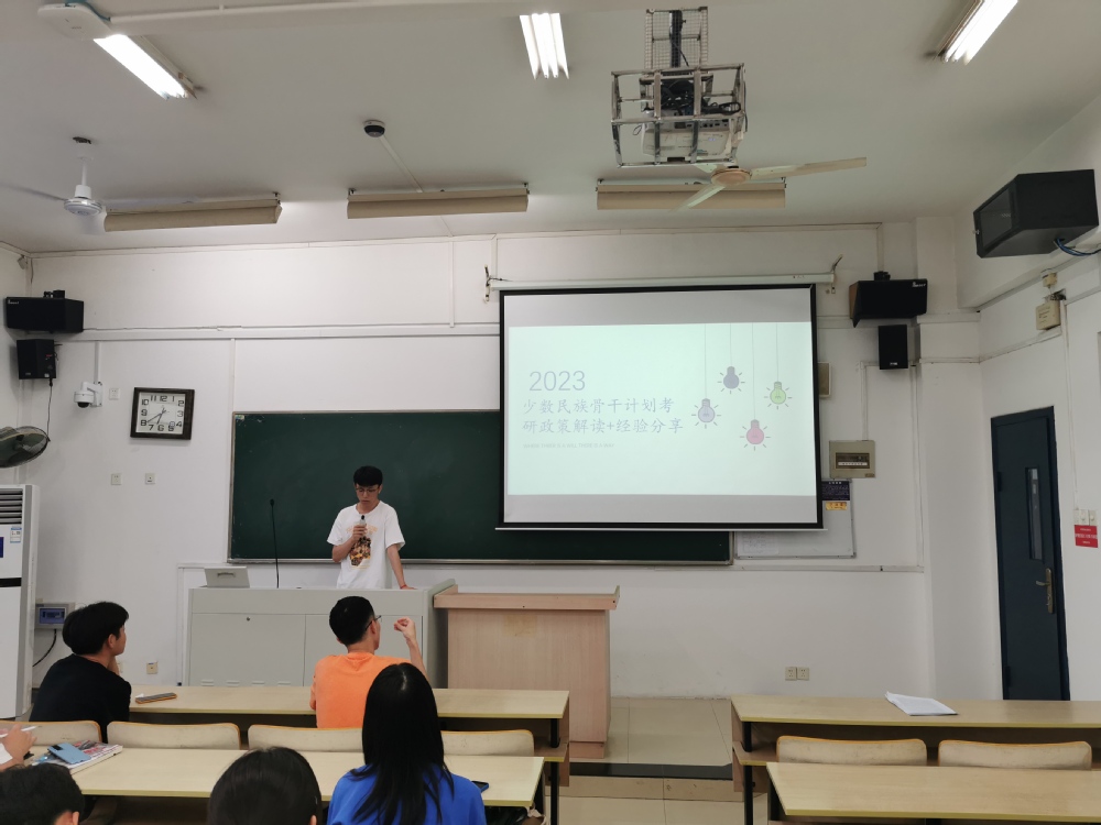 会上,辅导员范建鹏通过视频和政策原文,就少数民族高层次骨干人才计划进行了详细地讲解和宣传。