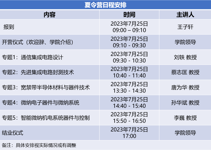 本次暑期夏令营设置:(1)通信集成电路设计;(2)先进集成电路封测技术;(3)宽禁带半导体材料与器件技术;(4)微纳电子器件与微纳系统四个专题,邀请领域内知名专家开设专题讲座。突出国内最新研究成果和学科前沿,以开阔学员视野、培养创新能力为办学目的。