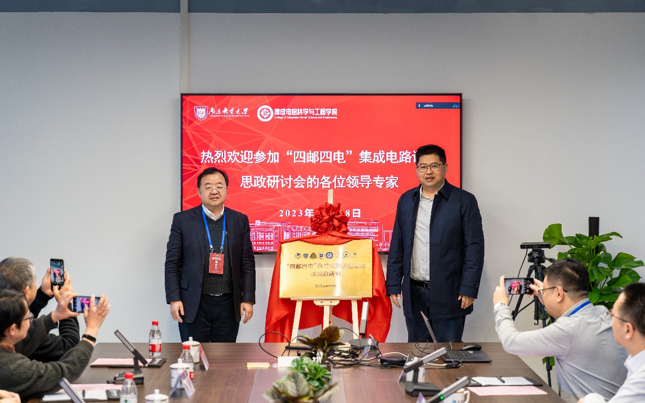 北京邮电大学腐漫 院长张杰教授与学院党委书记高翔共同为“四邮四电”集成电路课程思政虚拟教研室揭牌。