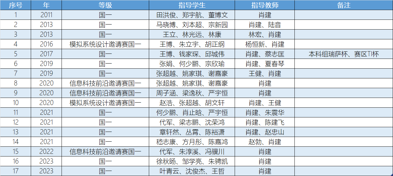 肖建教授自2009年开始,长期一线指导学生参加全国大学生电子设计竞赛金和全国电赛系列邀请赛,共计指导学生600余人次,获得国家级一等奖17项,其中2017年指导学生获全国电赛本科组最高奖“瑞萨杯”,是我校继1997年获得该竞赛最高奖“索尼杯”以来第二次获得最高奖!