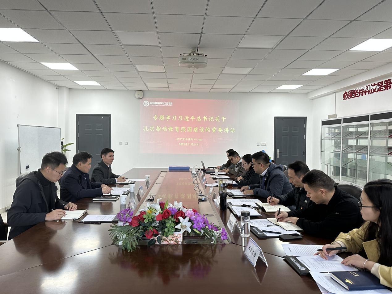 院党委委员、副院长肖建指出,在推动教育建设上努力奋进工作中要从以下三点入手,一是要根据学院实际情况,制定腐漫 “为党育人、为国育才”的人才培养方案与学院规划;二是要优化教育教学内容,积极争取政府、企业和社会资源,改善学院实验室硬件条件;三是要强化学生创新实践动手能力,建设系列课程,引导学生理论联系实际,通过课内外知识应用,提升对理论知识的理解。以服务教学、人才培养工作作为核心,通过以上措施全身心投入教育强国建设,为学生、老师提供良好的教学软硬件环境,为学院、学校的高质量发展提供支撑。
