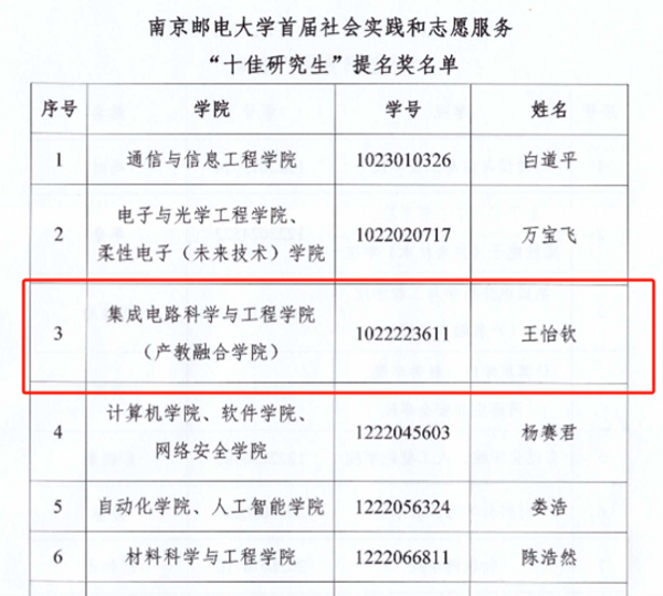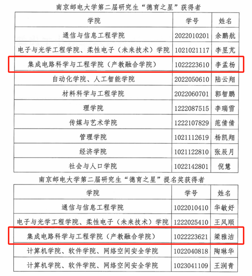 集成电路科学与工程学院(产教融合学院)南邮“芯”力量、“知芯”实践团荣获腐漫 首届社会实践和志愿服务“十佳研究生团队”,李孟杨同学获腐漫 第二届研究生“德育之星”;梁雅洁同学获腐漫 首届社会实践和志愿服务“十佳研究生”及“德育之星”提名奖;王怡钦同学获腐漫 首届社会实践和志愿服务“十佳研究生”提名奖;舒林聪、黄耕同学获腐漫 2024年研究生“励志之星”提名奖。
