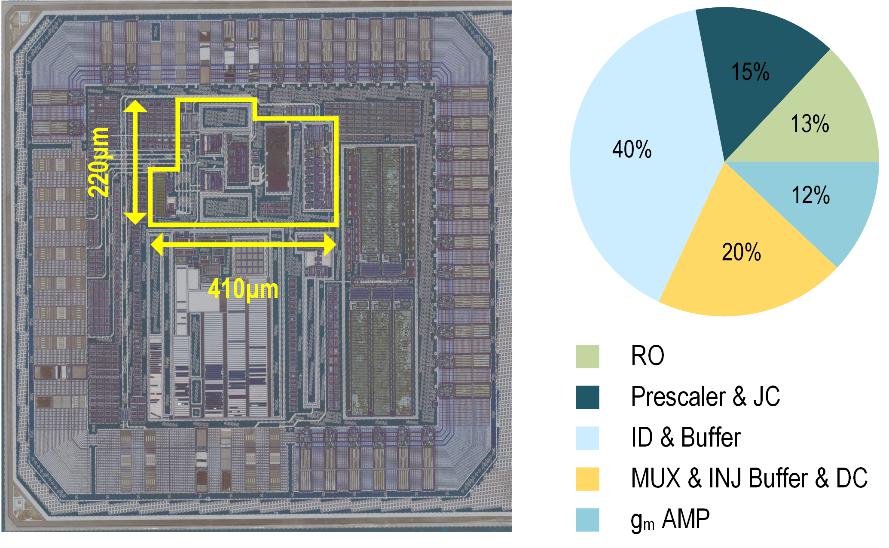 针对以上问题,团队提出一种基于相位误差自动校准的单边注入技术,引入负反馈对注入信号相位实时校准,从根本上克服了注入频偏对启动速度的影响。研究团队基于40纳米CMOS工艺完成了芯片的原型开发,实验结果表明,在注入频偏为±1%的范围内,时钟启动时间均小于19μs,突破了注入频偏的常规容限(5000ppm)。多样片(30pcs)测试结果显示,在0.95~1.05V电压范围内,采用单边注入技术的有效样片数量比传统注入技术高69%。由此可见,团队提出的单边注入技术显著提升了电路鲁棒性和芯片良率,对推动注入技术的落地应用和快启动时钟芯片的商用进程具有重要意义。