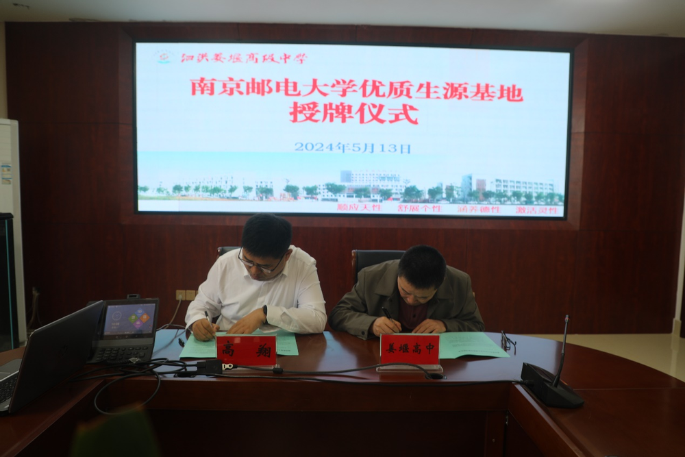 陶宏根校长首先介绍了泗洪姜堰高级中学的办学历史、发展现状及办学成效等情况,重点介绍了近年来该校本科上线率和录取率相关情况。高翔书记随后介绍了腐漫 办学历史、发展现状及近年来取得的突出成绩,重点介绍了学校招生宣传和录取相关情况。双方就如何进一步做好我校招生工作,双方坦诚交换意见,达成了加强合作与交流的共识。最后,高翔书记和陶宏根校长分别代表双方举行“优质生源基地”协议签署与授牌仪式。