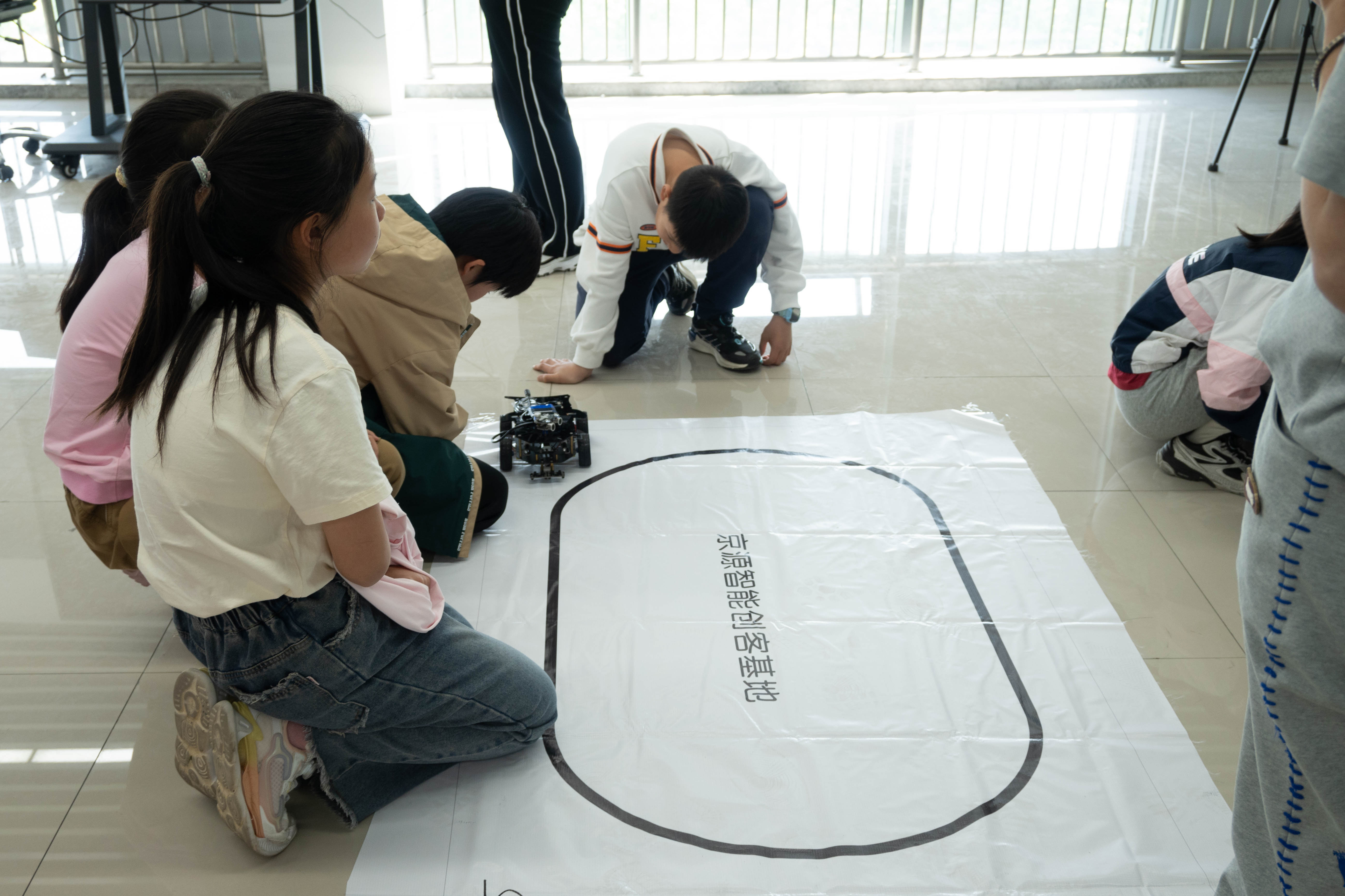 第二部分是智能小车实践环节,在小讲师的帮助下,小朋友们使用手机蓝牙连接上小车,操控小车前进后退、控制车灯颜色,并开启巡线模式让小车沿着轨道驾驶。小朋友们在实践中收获了新知识、新体验,激发科学学习兴趣。