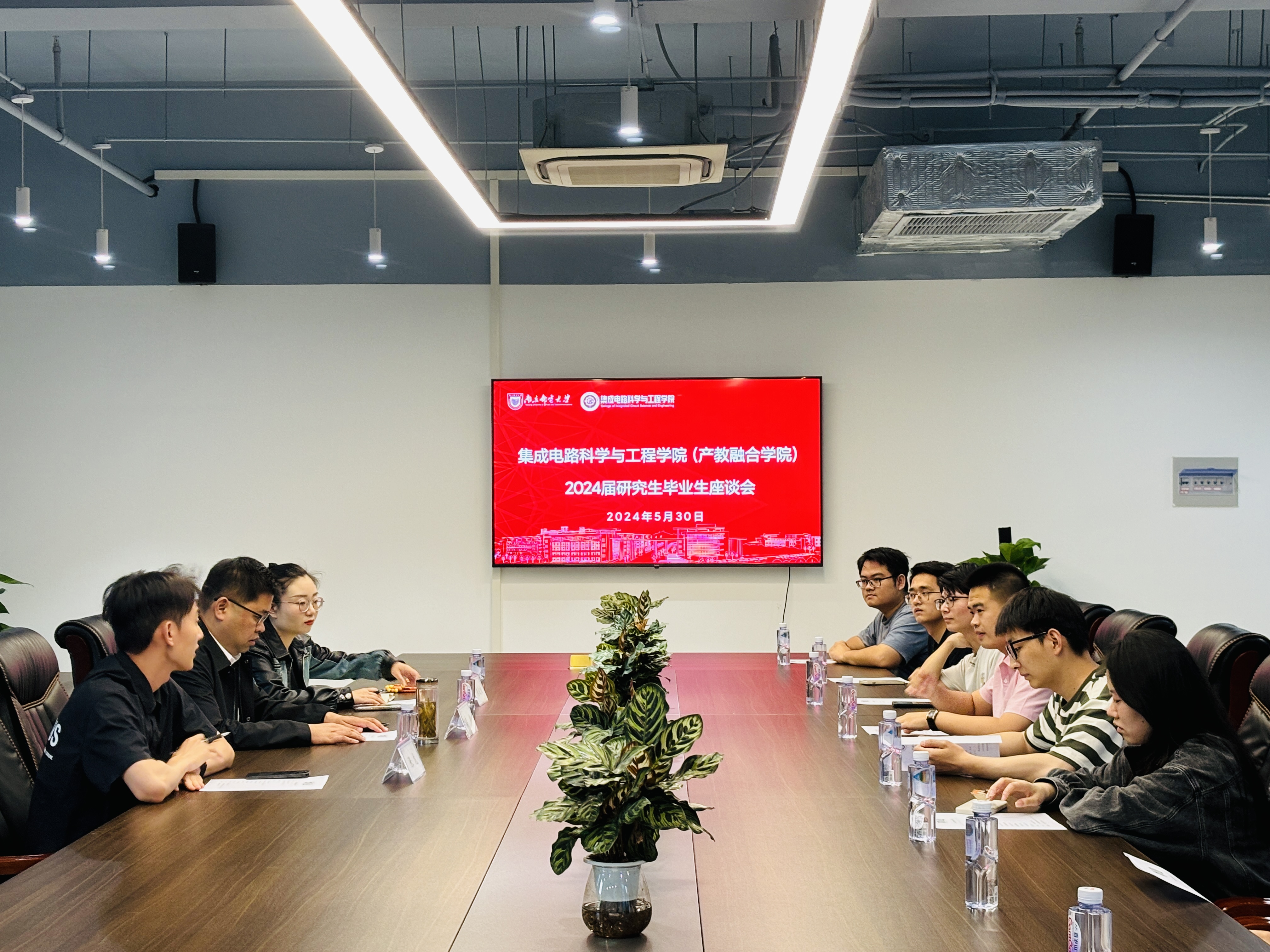 5月30日下午,为进一步了解浦口办学点毕业班研究生思想动态,做好文明安全离校工作,倾听学生建议与意见,推动研究生培养工作,集成电路科学与工程学院(产教融合学院)在浦口办学点208会议室召开了2024届研究生毕业生座谈会。学院党委书记高翔,学院党委副书记、副院长肖俊桂,毕业班辅导员张龙以及各班毕业研究生9位代表参加了座谈。座谈会由研究生辅导员张龙主持。