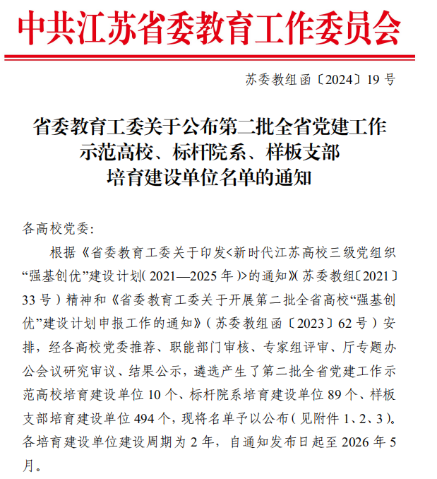 根据《省委教育工委关于公布第二批全省党建工作示范高校、标杆院系、样板支部培育建设单位名单的通知》苏委教组函〔2024〕19号,腐漫 微电子系教工党支部成功入选第二批全省党建工作样板支部培育建设单位。
