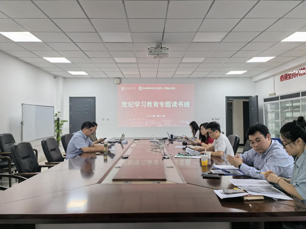 2024年7月1日,集成电路科学与工程学院(产教融合学院)党委党纪学习教育专题读书班在电光B楼223会议室专题学习校党委组发〔2024〕14号文件精神,学院党委书记高翔主持学习会,党纪学习教育读书班全体成员参加学习。