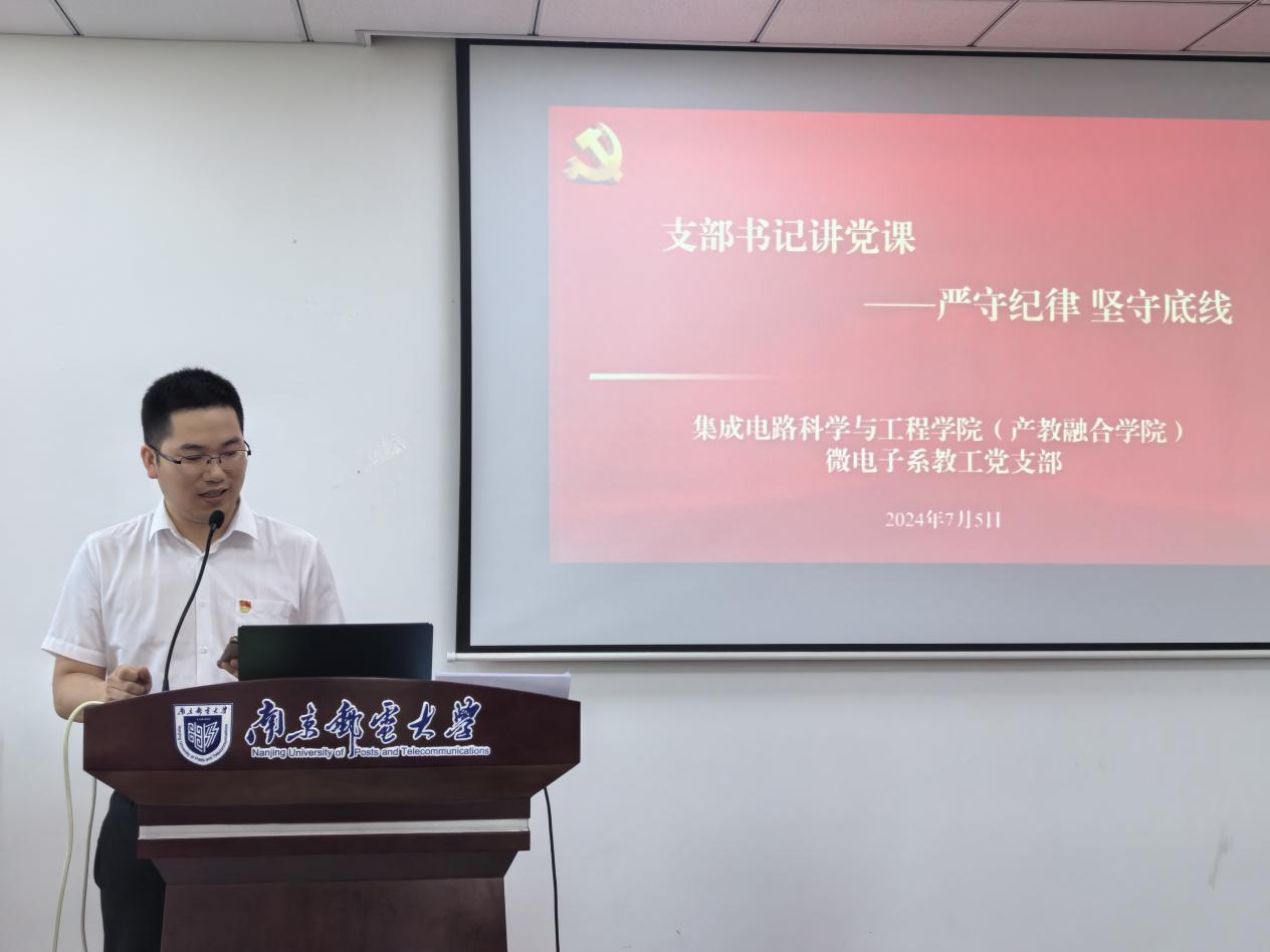 7月5日下午,集成电路科学与工程学院(产教融合学院)微电子系教工党支部开展党纪学习教育纪律党课。此次党课由微电子系教工党支部书记姚佳飞同志主讲,支部党员教师积极参与、共同学习。