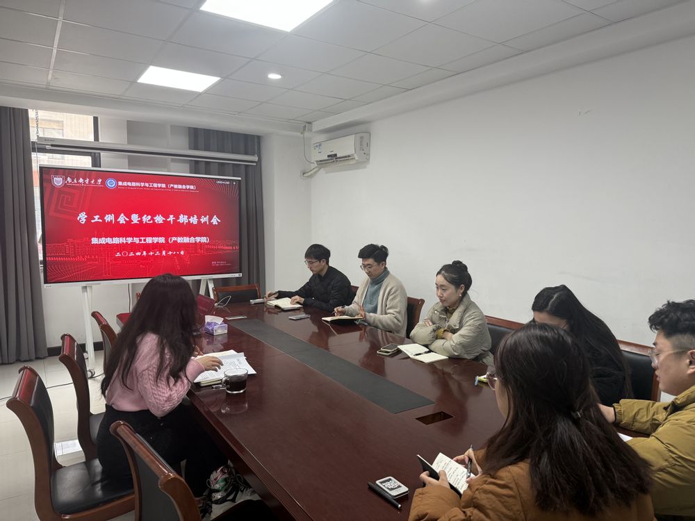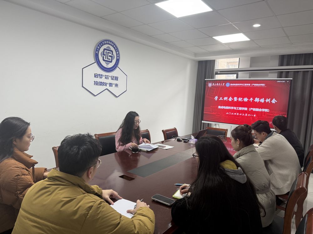 12月18日上午9:00,集成电路科学与工程学院(产教融合学院)在B212会议室召开学工例会暨学生党支部纪检委员培训会,会议由学院党委副书记、副院长、兼职纪检委员肖俊桂主持,全体辅导员、学生党支部纪检委员参会。