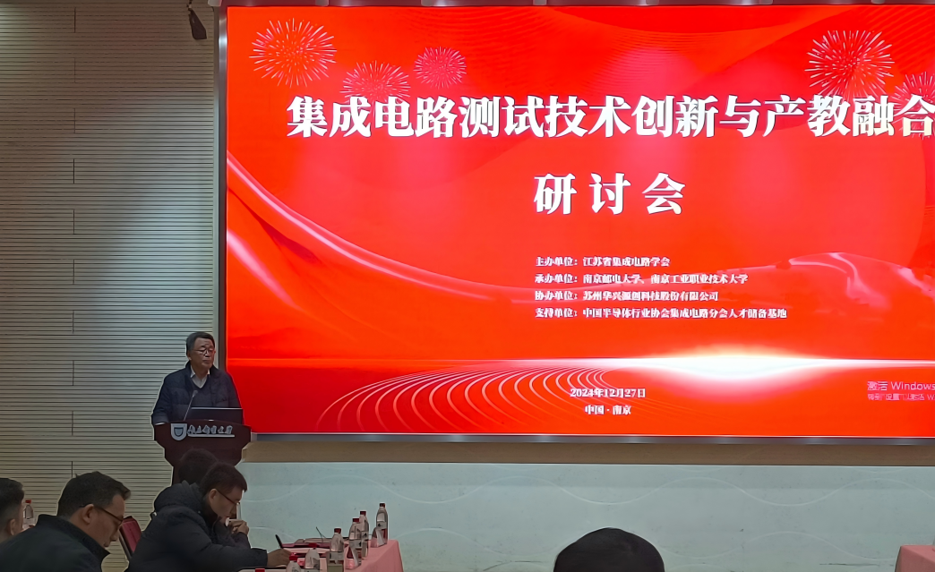 20241227日,“集成电路测试技术创新与产教融合研讨会”在腐漫 仙林校区顺利召开!本次会议由江苏省集成电路学会主办,腐漫 和南京工业职业技术大学承办,苏州华兴源创科技股份有限公司协办,中国半导体行业协会集成电路分会人才储备基地支持。本次研讨会旨在汇聚行业智慧,探讨集成电路测试技术的最新发展以及产教融合实践路径。来自学会、协会行业专家、东南大学、南京航空航天大学、南京理工大学、腐漫 等省内本科院校代表,南京工业职业技术大学、无锡职业技术学院、苏州市职业大学等省内职业院校代表,山东科技大学、绍兴文理学院等省外院校代表,以及江苏芯德半导体科技股份有限公司、苏州华兴源创科技股份有限公司等企业代表,近50人参加。研讨会学院副院长靳雷生主持。