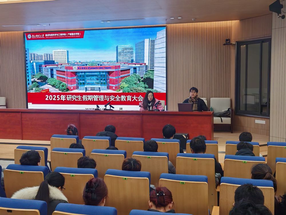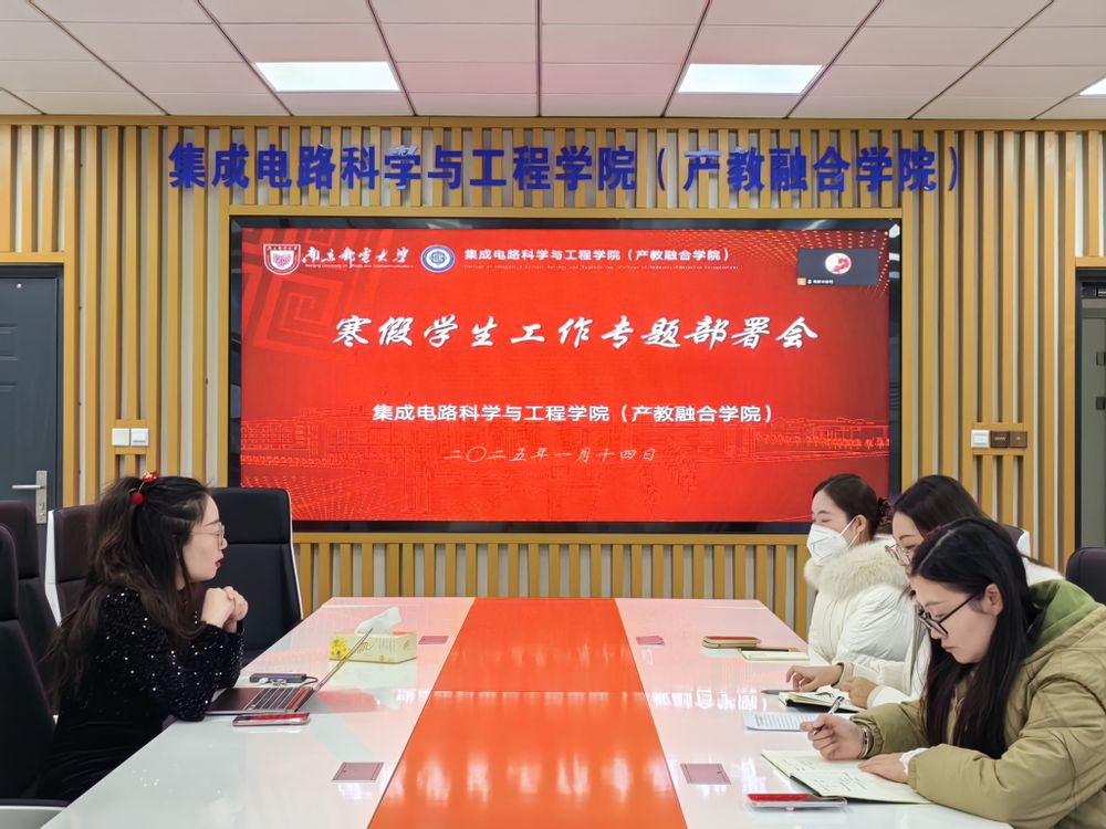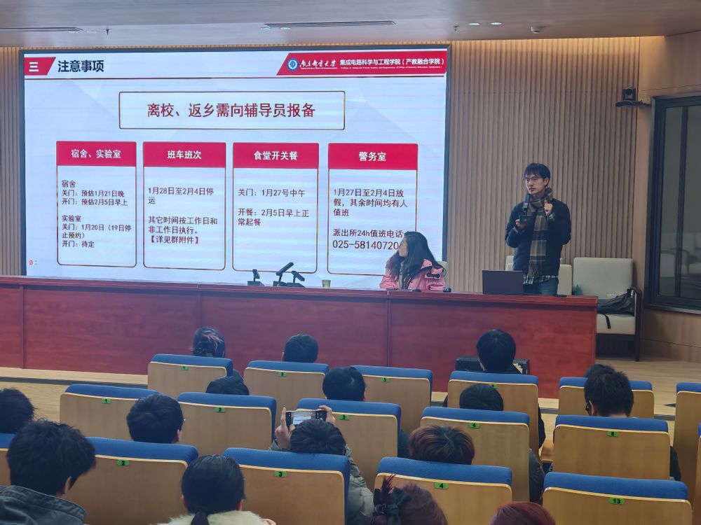 1月14日上午10:45,集成电路科学与工程学院(产教融合学院)在仙林校区电光学科楼B223会议室和腾讯会议线上线下同时召开学生寒假安全工作部署会,会议由院党委副书记、副院长肖俊桂主持,学院全体辅导员参加。