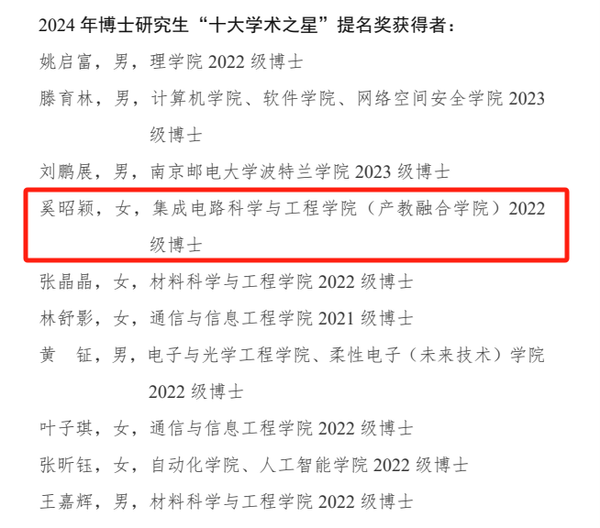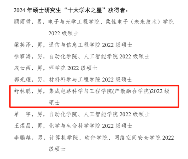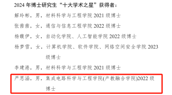 祝贺上述同学荣获各项荣誉,此次评选活动不仅是对获奖同学学术能力的肯定,更是对腐漫 研究生培养工作的认可。希望获表彰的同学珍惜荣誉,再接再厉,继续在学术道路上勇攀高峰,充分发挥先锋模范和学习表率作用。同时,学院也将以此为契机,进一步总结经验,积极探索创新人才培养模式,为国家芯计划培养更多优秀人才。