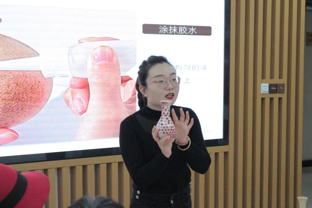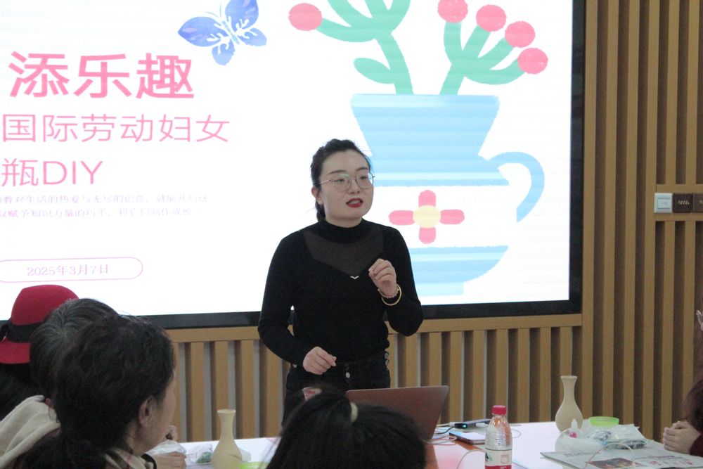 活动伊始,学院工会主席肖俊桂代表学院向全体参会女教职工以及女学生代表致以节日的祝福。随后,肖主席为大家带来了一场生动的花瓶DIY教学。从色彩搭配到材料运用,细致入微地讲解激发了大家的创作灵感。
