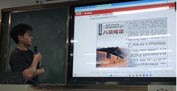 党课伊始,支部副书记、学生代表卞大井同志带领全体党员研读习近平总书记关于加强党的作风建设的重要论述,从中我们深刻了解到加强党的作风建设对我党的重大意义和核心要义,而中央八项规定正是改进作风的切入口和动员令,是长期有效的铁规矩,是习近平总书记对新时代加强党的作风建设重大举措作出的生动表达。在卞大井同志的带领下,研究生第一党支部全体党员同志认真学习了中央八项规定精神,在了解其具体内容的同时深刻体会中央八项规定精神对党的作风建设带来的重要影响。