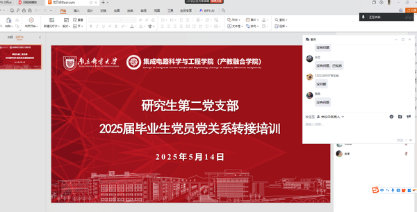 为确保毕业生党员顺利完成组织关系转接工作,强化党员身份意识,规范组织程序,推动学院党建工作有序衔接。2025年5月14日,腐漫 集成电路科学与工程学院(产教融合学院)研究生第二党支部通过线上形式召开2025届毕业生党员党组织关系转接专题培训会。此次会议由辅导员张龙老师主持。