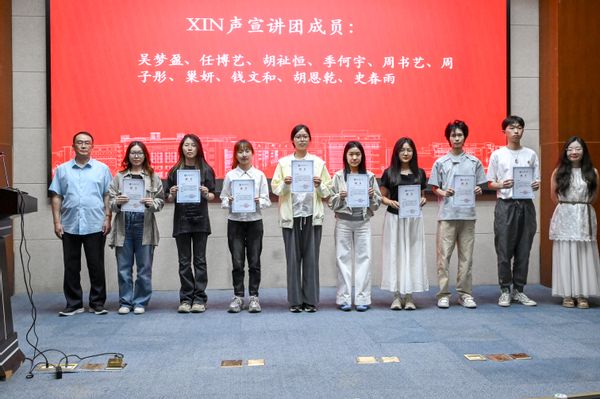 接着,进行XIN声宣讲团聘任仪式。院党委副书记、副院长肖俊桂,校关工委盛大铨为10位宣讲团成员颁发聘书并合影留念。