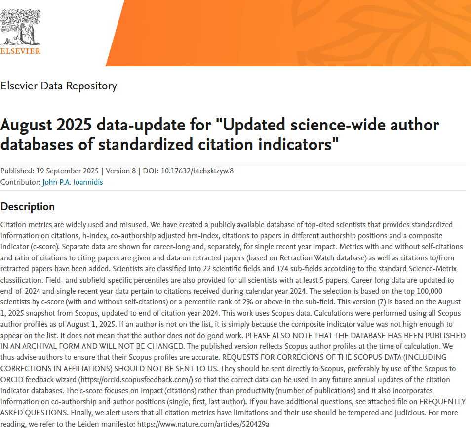 参考文献:Ioannidis, John P.A. (2025), “August 2025 data-update for "Updated science-wide author databases of standardized citation indicators"”, Elsevier Data Repository, V8, doi: 10.17632/btchxktzyw.8