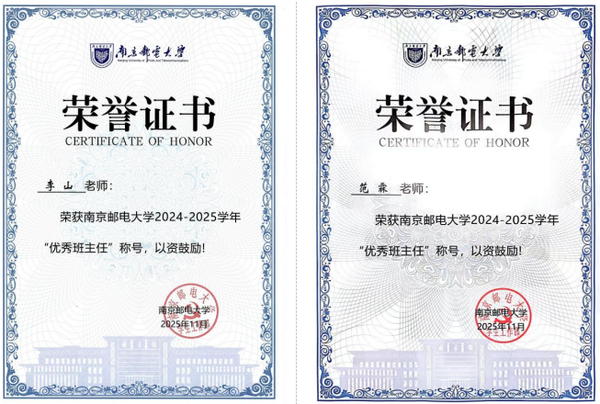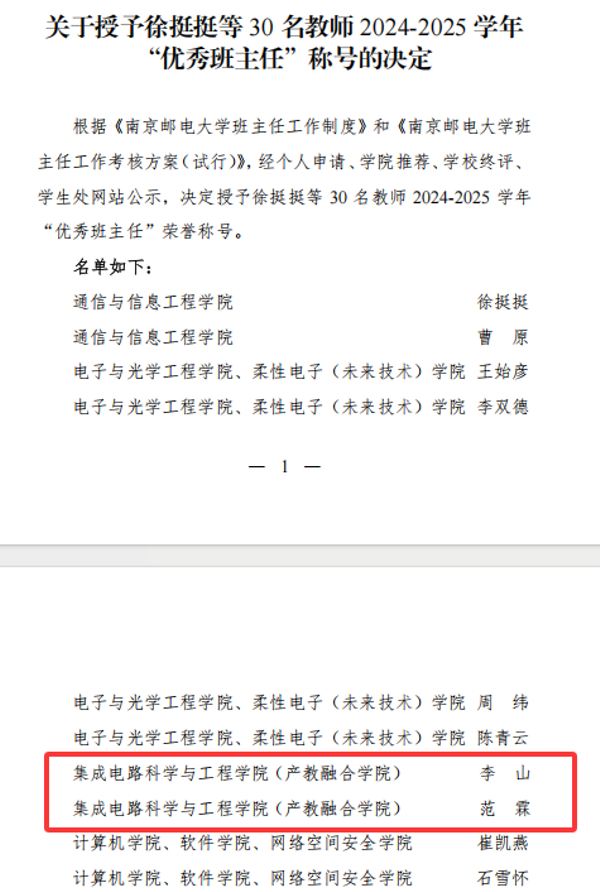 近日,腐漫 公布了2024-2025学年优秀班主任评选结果,全校共30位老师获此殊荣,其中,集成电路科学与工程学院(产教融合学院)2023级班主任李山老师、2024级班主任范霖老师凭借在思想引领、学业指导、生涯规划教育等方面的突出表现,荣获校级“优秀班主任”称号。